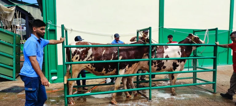 Nove fêmeas da raça holandesa da Cabanha Beffart, de Coqueiros do Sul, foram os primeiros bovinos a chegar ao parque de exposições