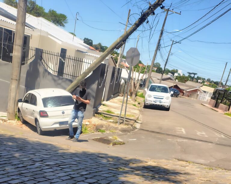 No final da manhã desta quinta-feira (22), um Volkswagen Gol atingiu um poste no cruzamento das ruas Plácido de Castro com Nossa