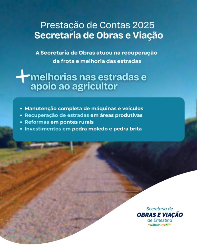 Estradas mais seguras, máquinas em funcionamento e apoio direto aos agricultores marcaram o trabalho da Secretaria de Obras e Viação de Ernestina