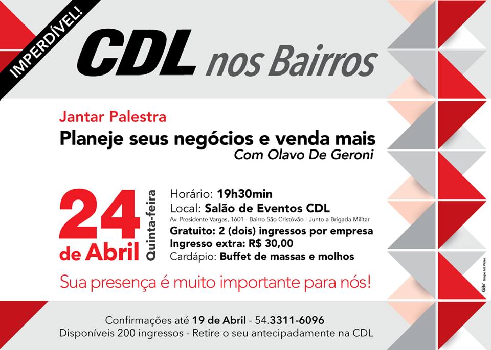 Inicia nesta quinta-feira, 24, a 5ª edição do CDL Bairros. O primeiro encontro deste ano será realizado no Bairro São Cristovão, com a palestra “Planeje seus negócios e venda mais”, ministrada pelo consultor empresarial Olavo De Geroni. A atividade contará com um jantar de integração para os associados participantes e será realizada a partir das 19h30min, no Salão de Eventos CDL, na Avenida Presidente Vargas, 1601, junto à Brigada Militar.