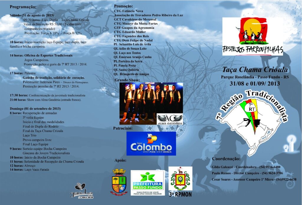 No domingo, 01 de setembro, haverá a recuperação de armadas e terceira volta de equipes, às 8h. No início da manhã também ocorrem as finais de dupla do rodeio e da Taça Chama Crioula, Laço Trio, Prova Campeira Livre e de Laço Equipe. Às 9h tem sorteio das equipes de bocha campeira e gincana do Jovem Tradicionalista. A bocha campeira começará às 10h. Além da recepção da Chama Crioula, que será junto à pista de laço, no período da manhã, no mesmo dia, às 14, haverá laço de Vaca Parada. “Este é um evento de grande relevância, já que reuniremos entidades de, pelo menos, trinta municípios da região”, comentou a coordenadora da 7a RT, Gilda Galeazzi. Com o tema “O Rio Grande do Sul no imaginário social”, os Festejos Farroupilhas 2013 acontecerão na cidade entre os dias 08 a 20 de setembro, com rondas em todas as entidades tradicionalistas da cidade, além de