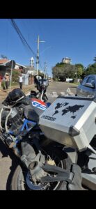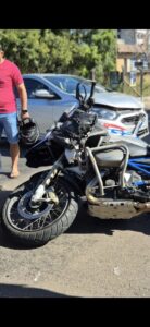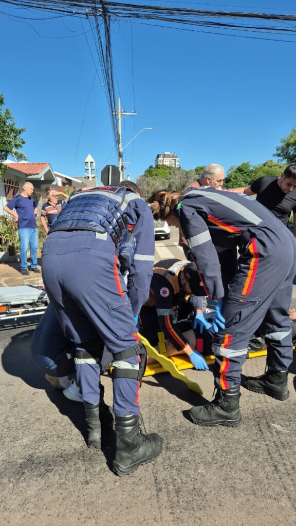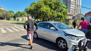 Uma colisão foi registrada na esquina das ruas Scarpellini Ghezzi e João Cony, em frente à Brigada Militar. O acidente envolveu um Chevrolet Ônix prata e uma motocicleta BMW, ambos com placas padrão Mercosul.