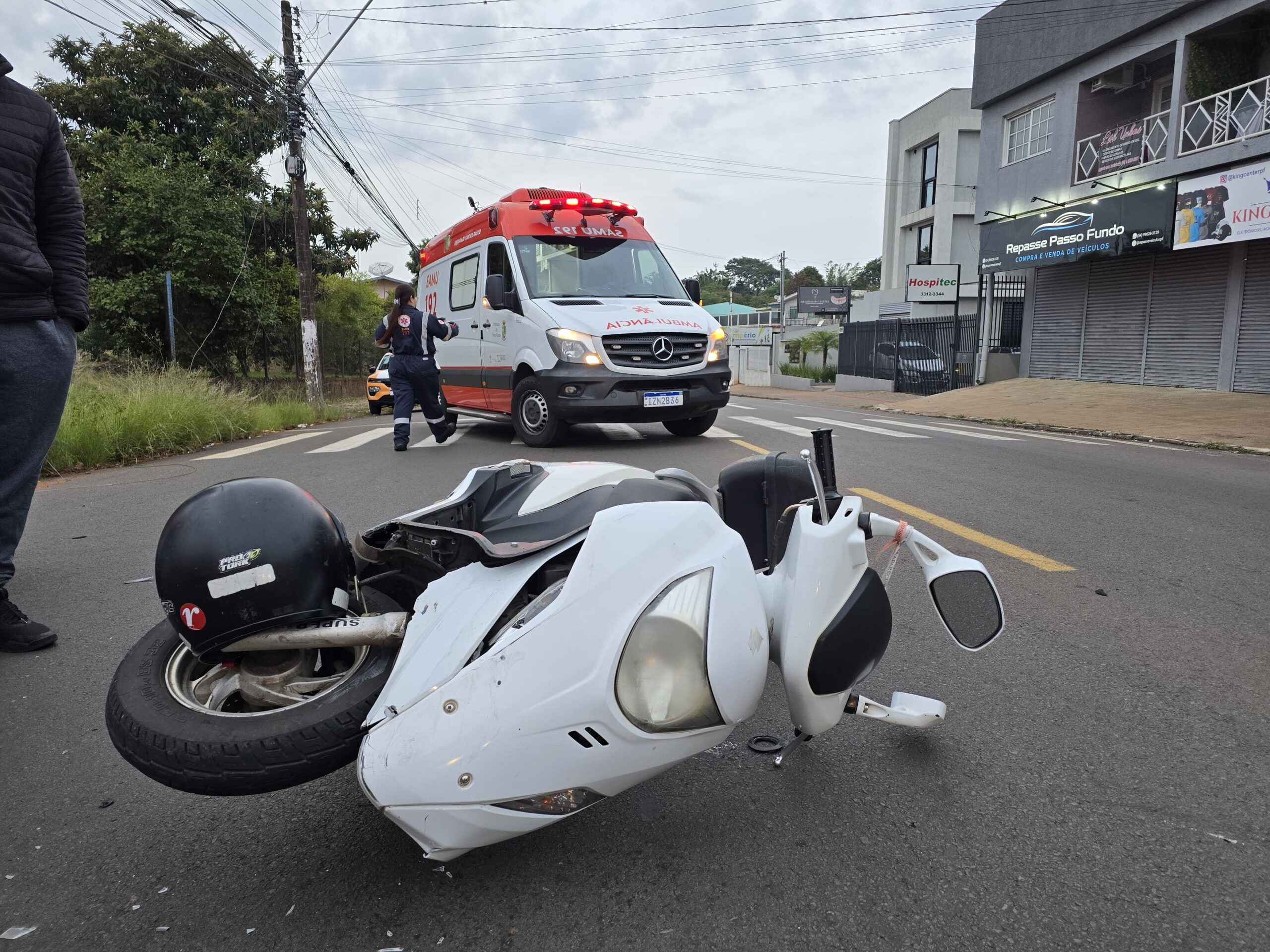 Na manhã desta quinta-feira (24), um acidente de trânsito foi registrado no cruzamento da Avenida Rio Grande com a rua Porto Alegre, no bairro Vera Cruz, em Passo Fundo. A colisão envolveu uma motocicleta Suzuki Burgman e um Chevrolet Onix branco.