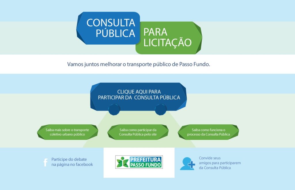 A Prefeitura de Passo Fundo deu o primeiro passo para a licitação que irá definir o novo modelo de transporte coletivo na cidade. Entrou no ar, nesta segunda-feira (07), o site criado para que a população possa dar sua opinião e sugestões para melhor o serviço prestado. A construção da página na internet faz parte da consulta pública que está sendo feita pela administração municipal, no período de outubro a janeiro de 2014, para começar a elaborar um novo modelo a partir do resultado desta consulta.