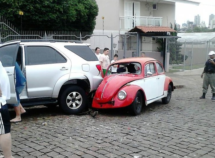 Policiais da Brigada Militar foram acionados por volta das 17h40 de ontem,01, para atender uma ocorrência de acidente de trânsito na rua São Lazaro no bairro Lucas Araújo. O condutor de um automóvel Fusca de cor vermelha, colidiu em uma caminhonete Toyota Hilux que estava estacionada.