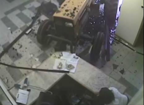 * As imagens são da câmera de monitoramento da Prefeitura e mostram o momento em que o trator invade o hall de entrada.