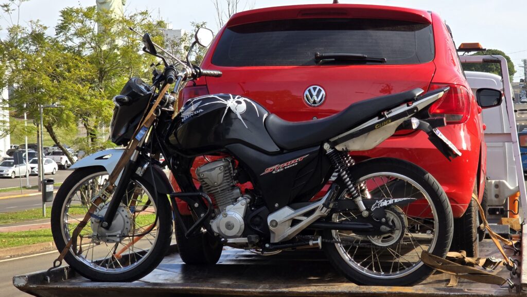 Durante patrulhamento tático, a guarnição localizou o automóvel e a motocicleta na praça, onde dois criminosos foram abordados. Na revista pessoal, os policiais militares encontraram com um dos homens uma máquina de cartão, R$ 102 em dinheiro, um esmurrugador e um pacote de seda. Com o outro indivíduo, foi localizado um celular e a chave do veículo.