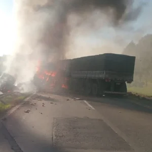 Segundo as informações, duas pessoas morreram. O acidente envolveu dois caminhões. O trânsito está totalmente bloqueado.
