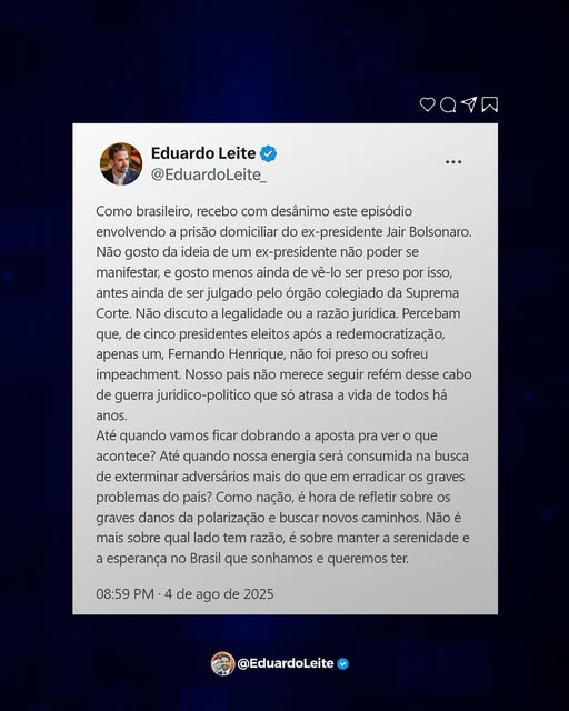 Para Leite, o episódio reflete um padrão preocupante da política brasileira, marcada por um ambiente hostil e por um “cabo de guerra jurídico-político” que, segundo ele, paralisa o país. O governador questionou: “Até quando nossa energia será consumida na busca de exterminar adversários mais do que em erradicar os graves problemas do país?”.