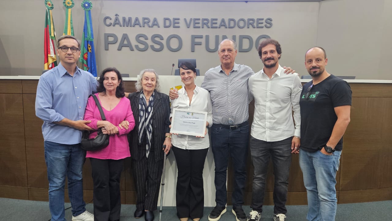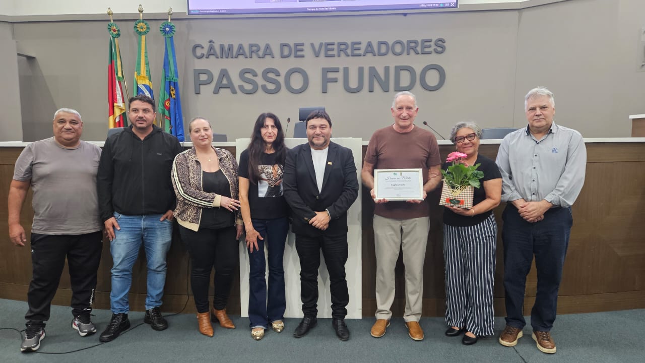 Através de proposição do vereador Douglas Pereto (PSD), foram homenageados o casal Lisete e Alcir Biazi, em reconhecimento à trajetória de mais de três décadas de dedicação ao Clube Comercial de Passo Fundo. A distinção destaca o trabalho do casal como ecônomos, marcado pela hospitalidade, pela boa gastronomia e pelo fortalecimento comunitário.