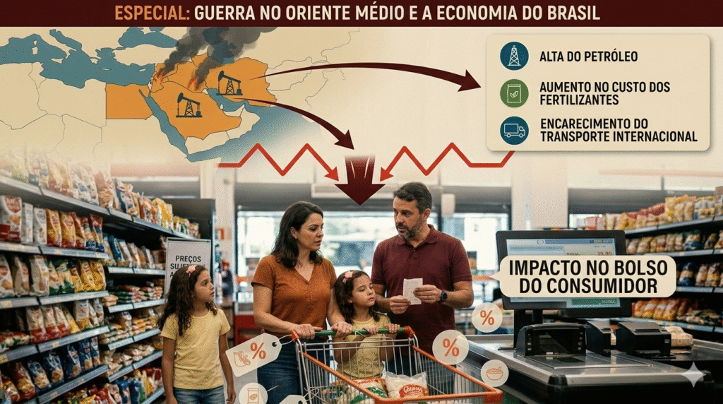 Mesmo acontecendo a milhares de quilômetros de distância, a guerra no Oriente Médio pode ter reflexos diretos no dia a dia dos brasileiros. Economistas alertam que o conflito entre Estados Unidos, Israel e Irã pode provocar alta nos preços de combustíveis, alimentos e fretes, além de trazer incertezas para o crescimento da economia brasileira em 2026.