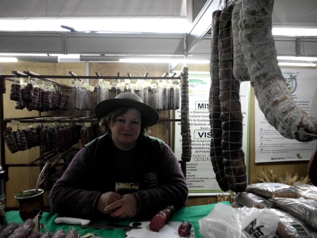 Ela conta que fabricam em torno de 700 kg de salame e 300 de copa por mês, com carne produzida na propriedade da família. Com isso conseguiu segurar os dois filhos na agricultura. Hoje até as notas trabalham na agroindústria da família.