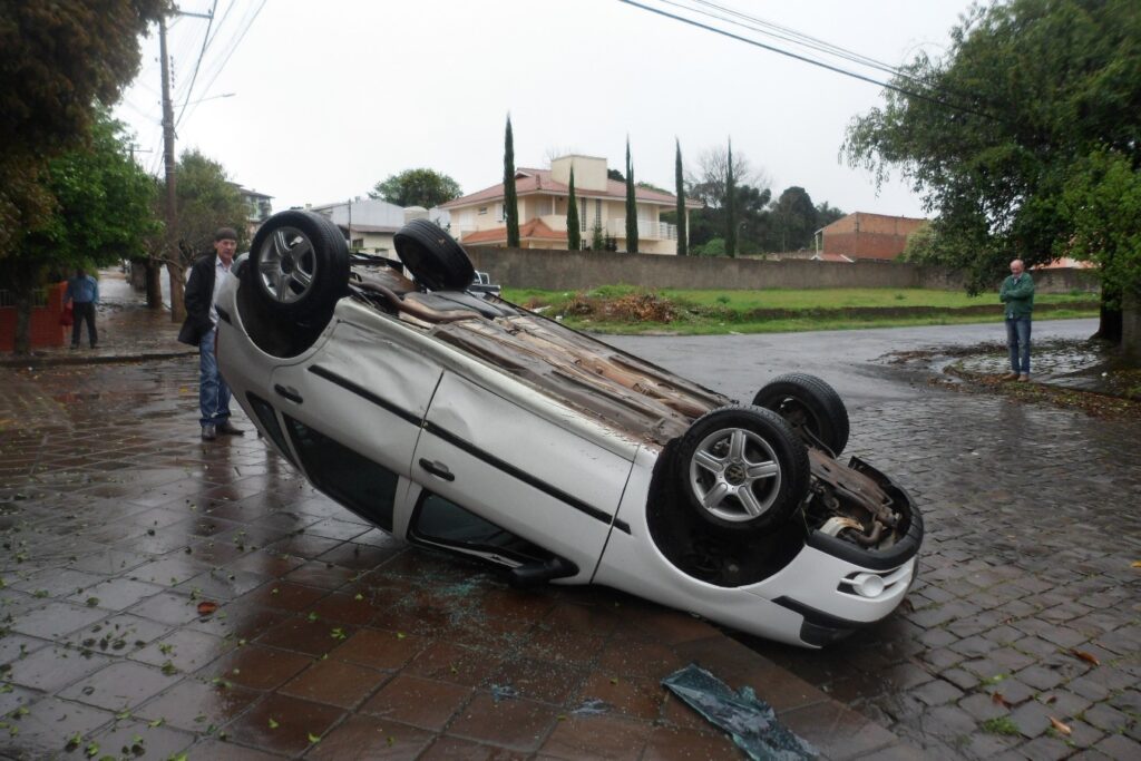 Com o impacto, o Gol capotou. Ninguém ficou ferido e foram registrados apenas danos materiais.