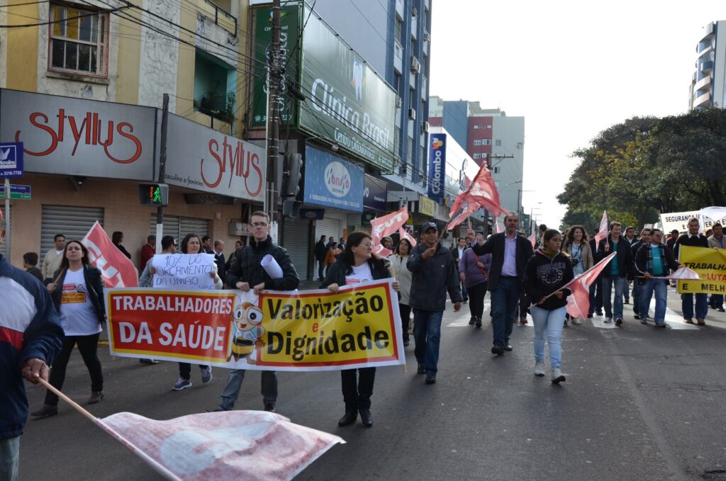 Várias pessoas estão em concentração na esquina da Av. Brasil com a Rua Bento Gonçalves. São trabalhadores de diversos setores carregando faixas, cartazes e gritando palavras de ordem. A cada momento cresce o número de participantes . O movimento no centro da cidade , no comércio, é muito pequeno muitas lojas optaram por fecharem as portas para atendimento ao público.