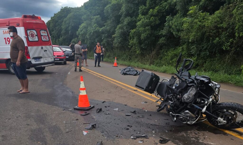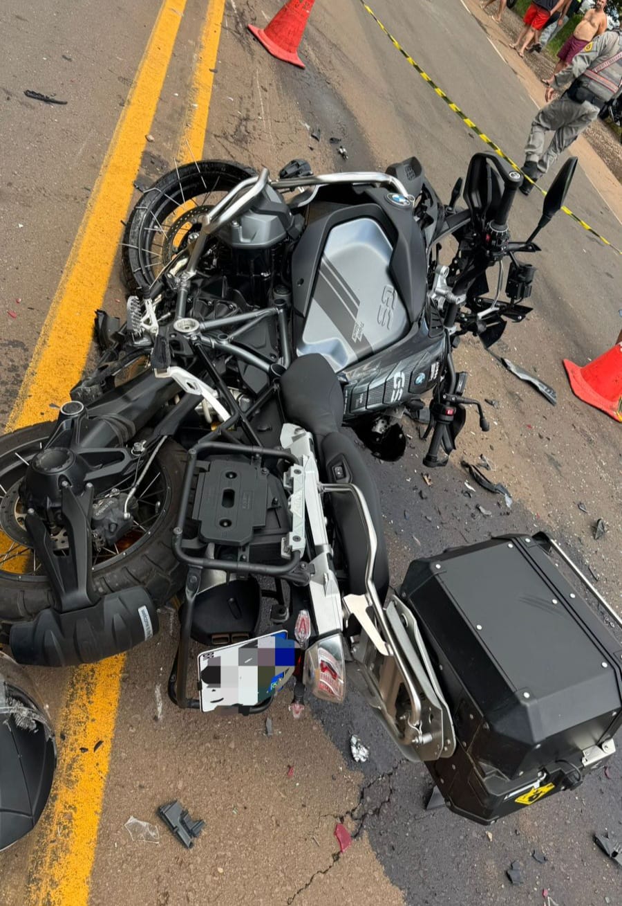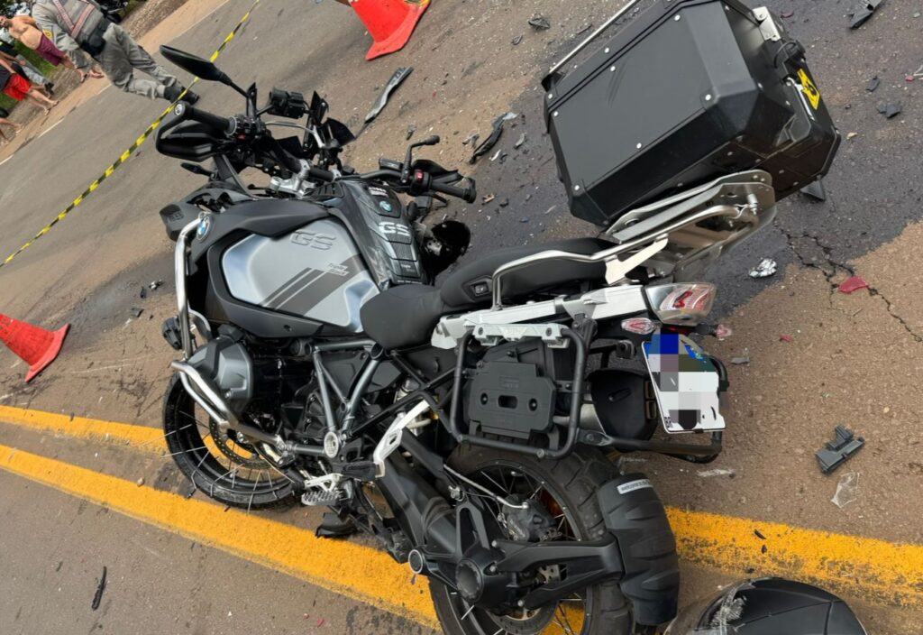 A motocicleta envolvida é uma BMW R1250GS Adventure, ano 2024, de cor preta, emplacada em Balneário Camboriú, Santa Catarina. A Blazer possui placas de Passo Fundo.