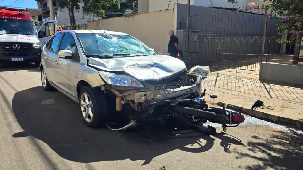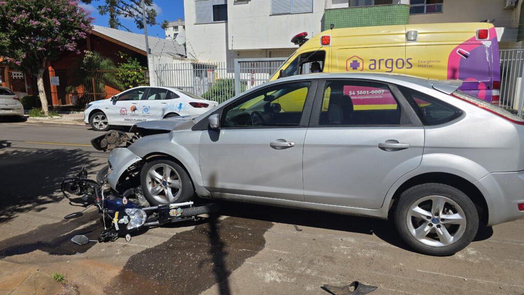Na tarde desta quinta-feira (26), um acidente de trânsito deixou dois homens feridos no cruzamento das ruas Tiradentes e Carolina Vergueiro, no bairro Annes, em Passo Fundo. A colisão envolveu uma motocicleta Yamaha Factor e um Ford Focus, ambos com placas no padrão Mercosul.