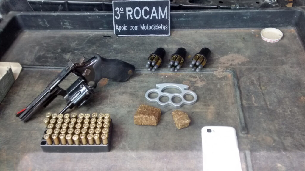 No interior do veículo os policiais encontraram um revólver calibre 38, recarregadores e mais de 50 projéteis intactos para calibre 38, além de uma porção de maconha. O suspeito identificado como Vagner Parnoff da Silva, 33 anos, foi encaminhado à Delegacia para o registro dos fatos e apreensão dos objetos.