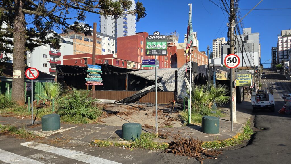 Na noite de domingo (1º), um incêndio de grandes proporções destruiu completamente um estabelecimento comercial no cruzamento das ruas Benjamin Constant e General Osório, no centro de Passo Fundo. No local funcionava anteriormente um restaurante especializado em espetinhos.