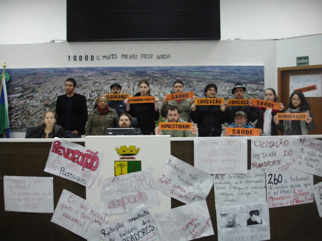 Desde a tarde de ontem um grupo de manifestantes ocupa a Câmara de Vereadores de Passo Fundo. Dentre as reivindicações estão a revogação do aumento da passagem dos coletivos urbanos de Passo Fundo e também a redução do salário dos vereadores da cidade.