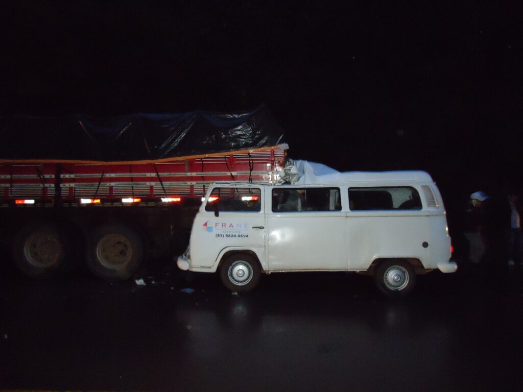 Quando retornou ao local, acompanhado dos integrantes da Polícia Rodoviária Estadual, constatou que um veículo Kombi, de cor branca, de placas IQJ-9923 acabou colidindo na traseira do caminhão e os passageiros morreram presos as ferragens.