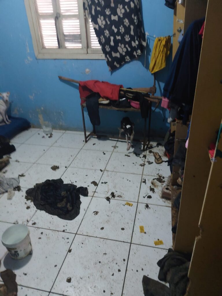 Ao chegar ao local, as equipes constataram que aproximadamente 19 cães viviam em uma residência de pequeno porte, cercada por acúmulo de sujeira, fezes espalhadas e armazenadas em sacos, além de um odor extremamente forte. Pelo menos quatro animais foram encontrados morto dentro do imóvel, demonstrando a gravidade do abandono e os riscos à vida dos animais. O cenário evidenciava não apenas maus-tratos, mas também risco à saúde pública, incluindo a possibilidade de zoonoses, e refletia condições precárias de vida tanto para os animais quanto para a moradora da residência.