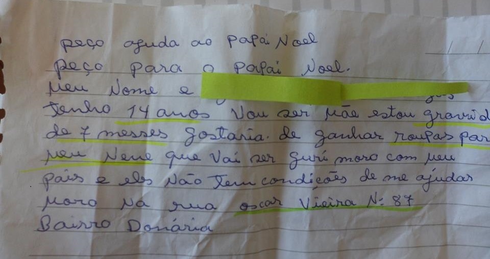 Segundo a adolescente seus pais não tem condições financeiras para ajuda-lá e pede ao “papai Noel” que consiga roupas para o seu filho que irá nascer no próximo ano.