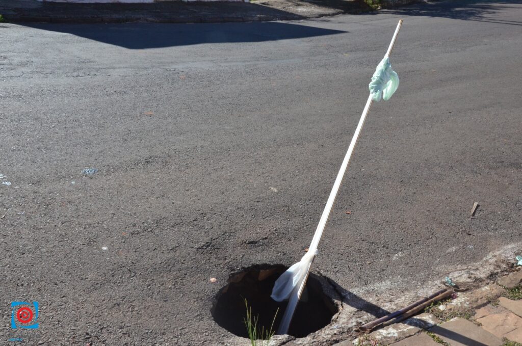 Os próprios moradores sinalizaram o buraco com uma estaca e sacolas plásticas, para que motoristas desatentos não acabem caindo na imensa cratera.