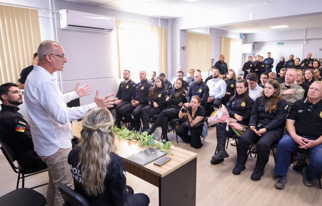 A cerimônia contou com a presença do secretário de Sistemas Penal e Socioeducativo, Jorge Pozzobom, do diretor de Monitoramento Eletrônico, Antonio Reisser, da delegada regional Manuella Peliciolli, além de autoridades e servidores da Polícia Penal.