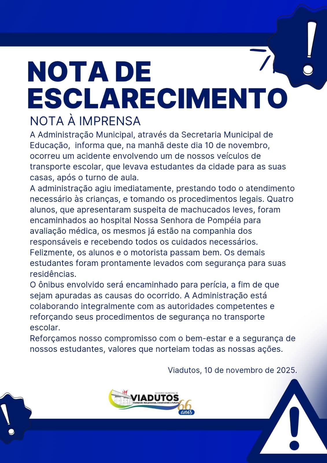 A Administração reforçou que está colaborando com as autoridades competentes e revisando seus procedimentos de segurança no transporte escolar, reafirmando o compromisso com o bem-estar e a segurança dos estudantes.