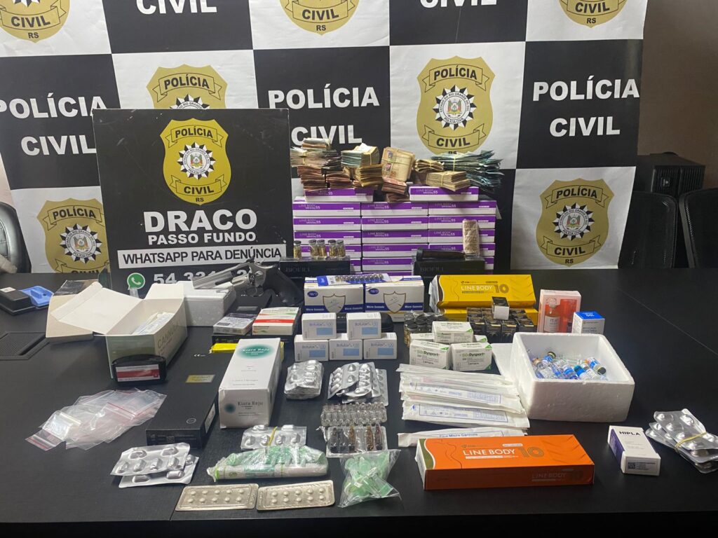 Em um dos endereços, os agentes apreenderam grande quantidade de anabolizantes, medicamentos e produtos estéticos de origem estrangeira, além de um revólver calibre .357, munições e mais de R$ 90 mil em dinheiro. Um homem foi preso em flagrante no local.