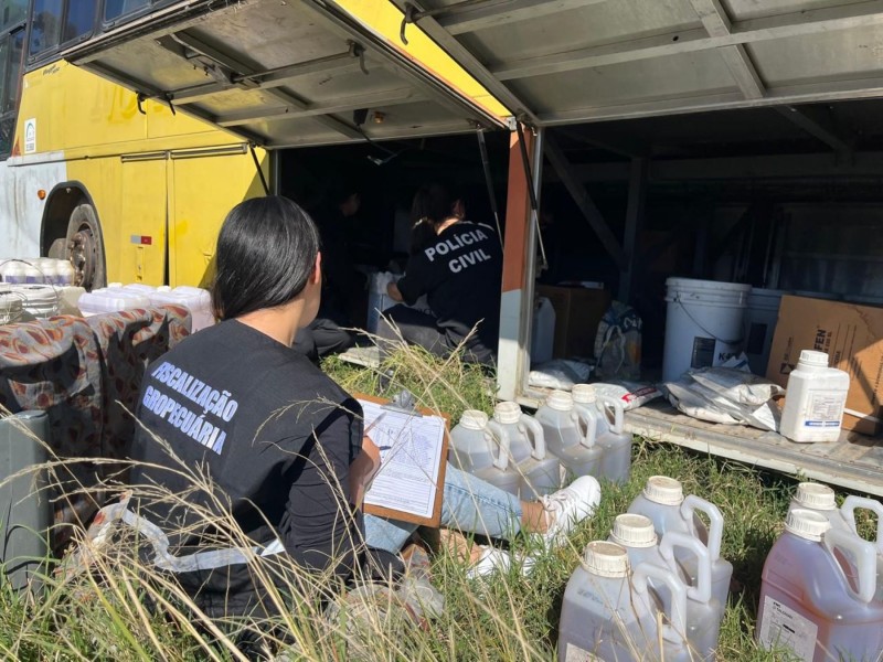 No local, foram apreendidos defensivos agrícolas sem comprovação de origem, armazenados dentro de um ônibus que também estava em situação irregular. Um caminhão com embalagens vazias desses produtos, também sem procedência, foi apreendido, e os lotes dos materiais foram registrados para identificação de possíveis vítimas.