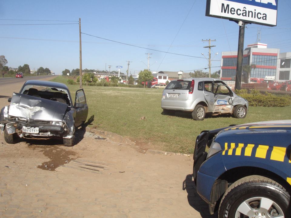 Chevrolet Chevette de cor cinza com placas de Passo Fundo seguia no sentido Carazinho/ Passo Fundo quando teve a frente cortada por um Ford Fiesta de cor cinza.