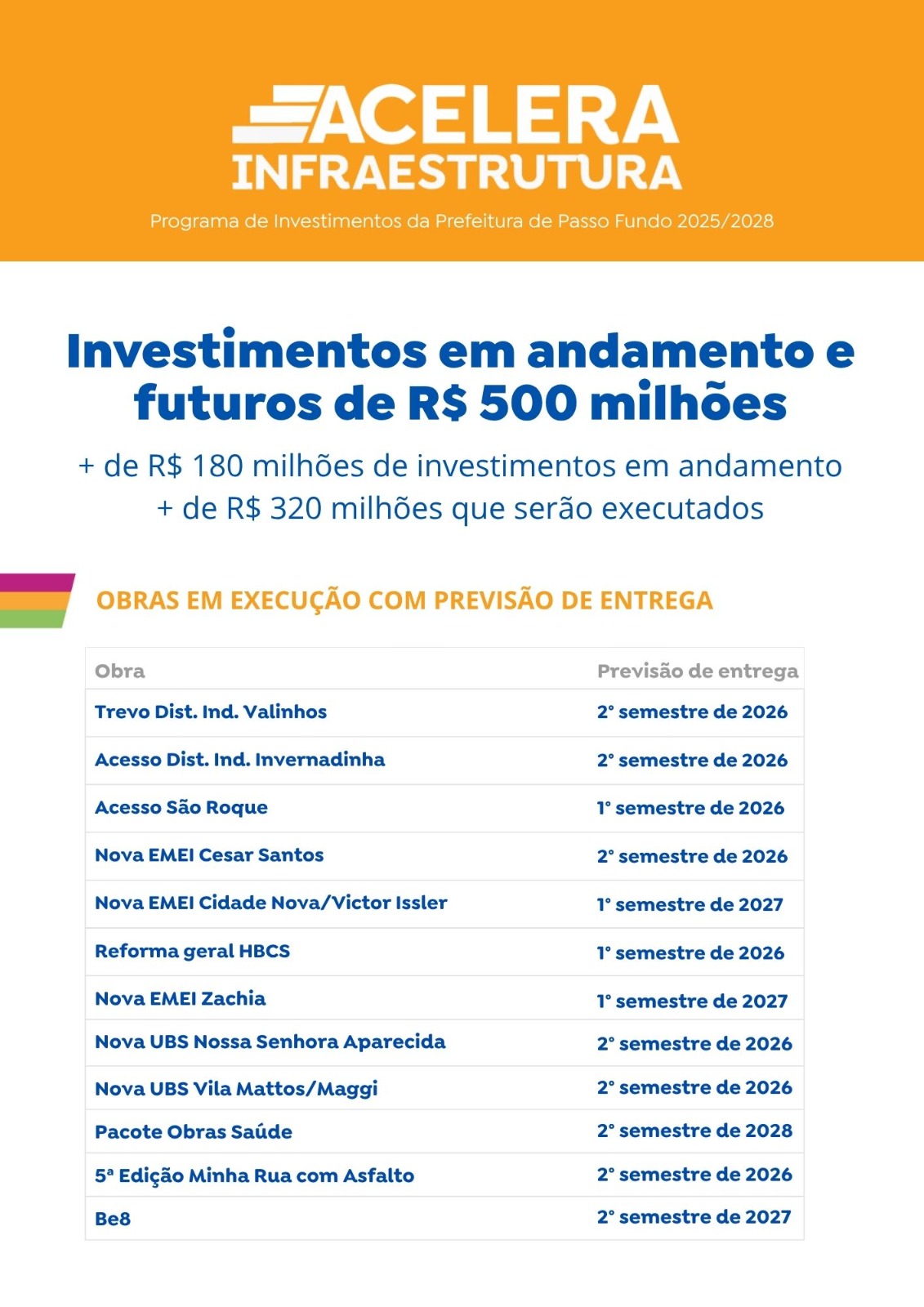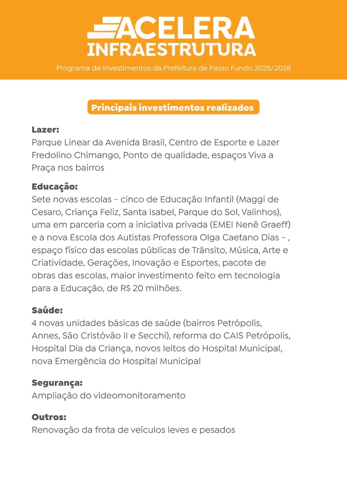 Pedro destacou que o programa reflete o planejamento e a capacidade de investimento do município. Nos últimos anos, foram investidos pela Prefeitura cerca de R$ 50 milhões por ano em ações que beneficiam diferentes áreas. “Passo Fundo vive um momento histórico de expansão. O Acelera Infraestrutura é o resultado de uma gestão que planeja, investe e entrega. Estamos falando de obras que vão impactar diretamente o dia a dia das pessoas e preparar a cidade para o futuro”, afirmou.