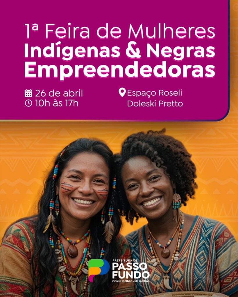 A Prefeitura de Passo Fundo, por meio da Coordenadoria de Promoção da Igualdade Racial, realiza dois eventos inéditos no município no dia 26 de abril: a 1ª Feira de Mulheres Negras Empreendedoras e a 1ª Feira de Mulheres Indígenas Empreendedoras. A proposta é ampliar a visibilidade e o reconhecimento de mulheres que, historicamente, enfrentam dificuldades de inserção e valorização nos espaços econômicos formais.