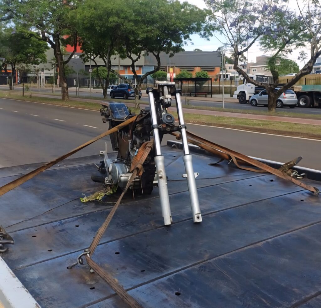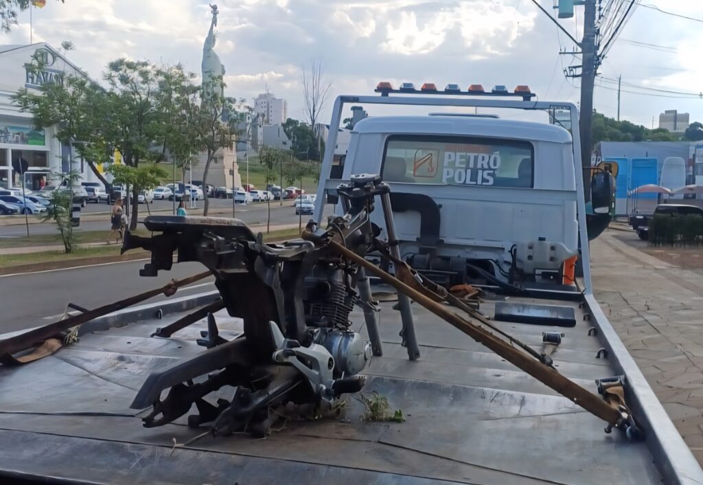 A motocicleta estava parcialmente desmontada no momento em que foi encontrada. O veículo foi recolhido pelo Guincho Petrópolis e encaminhado à Delegacia de Polícia de Pronto Atendimento (DPPA) para os procedimentos legais.