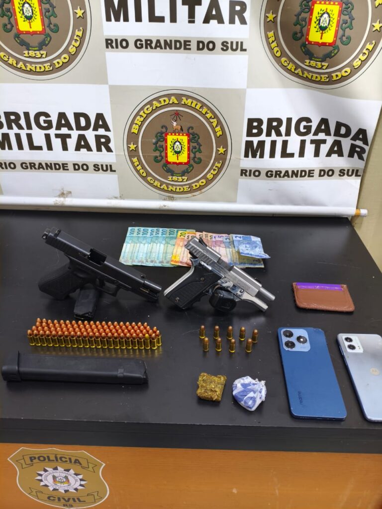 Entre os itens recolhidos estão uma pistola Glock 9mm, uma pistola calibre .380, 81 munições de 9mm, 9 munições calibre .380, três carregadores, duas porções de maconha e dinheiro. O caso será investigado pela Polícia Civil.