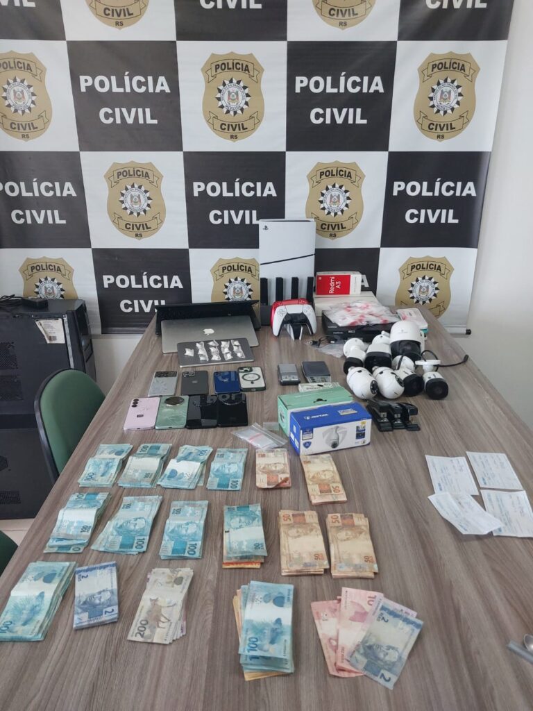 Durante o cumprimento dos mandados de prisão e de busca e apreensão, os policiais localizaram um fundo falso em uma mesa de cabeceira. No espaço, estavam armazenadas porções de cocaína prontas para venda, uma balança de precisão, materiais para embalar as drogas e uma quantia significativa em dinheiro. Diversos outros objetos que, segundo a polícia, seriam oriundos do crime também foram apreendidos.