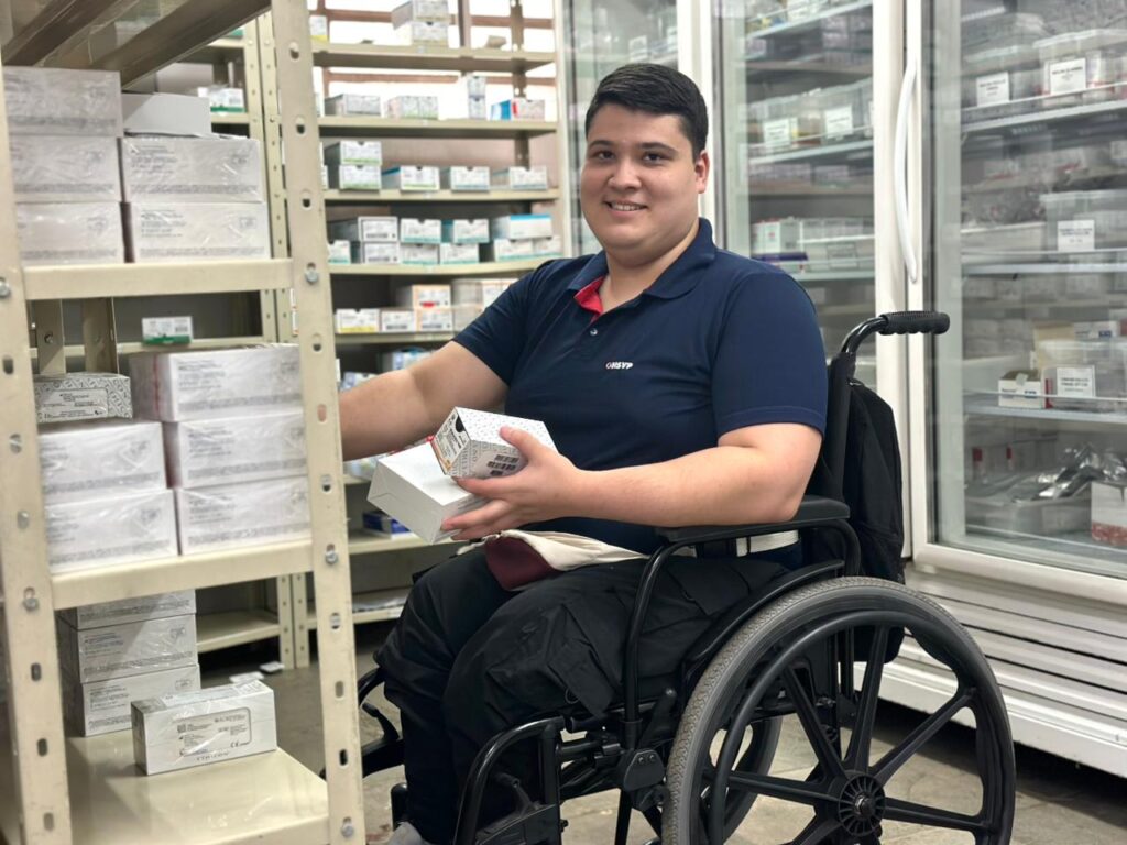 Lucas Klein da Silva, 23 anos, conquistou seu primeiro emprego no Hospital há dois anos. Atualmente, atua como auxiliar de apoio no Almoxarifado Central e celebra a oportunidade proporcionada pelo programa: “Eu gosto demais de vir trabalhar. Acordar cedo, fazer o que tem que ser feito. Me sinto muito à vontade com meus colegas. Sou muito feliz, gosto da minha independência. Ter o meu dinheiro, meu horário, minha rotina. O hospital é um ótimo lugar para trabalhar. Fui em muitos lugares e não consegui. E aqui foi onde me abraçaram”.