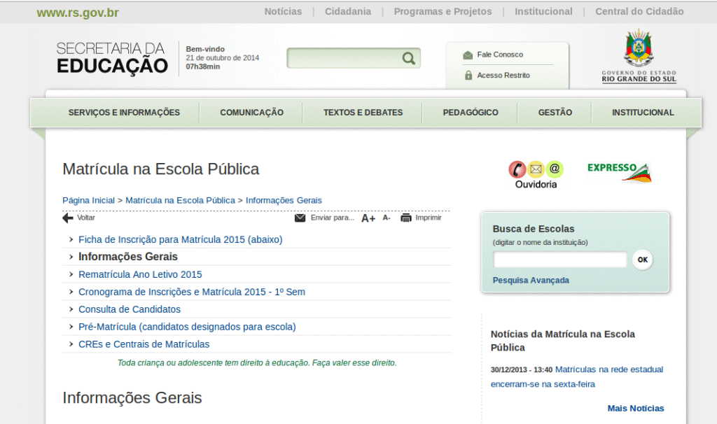 O calendário de matrículas na rede estadual para 2015 está em andamento desde o início de outubro. A rematrícula dos estudantes já inscritos nas escolas estaduais deve ocorrer até o dia 31, na própria instituição. A inscrição para ingresso no 1º ano ou 1º ciclo do Ensino Fundamental e 1º ano do Ensino Médio Politécnico, Educação Profissional Integrada ao Ensino Médio, Curso Normal (Magistério) e cursos técnicos subsequentes deve ser feita também até o dia 31, no site da Secretaria de Educação (Seduc): www.educacao.rs.gov.br, no link Matrícula na Escola Pública. As matrículas acontecerão de 5 a 13 de janeiro de 2015, na escola para a qual o candidato foi designado.