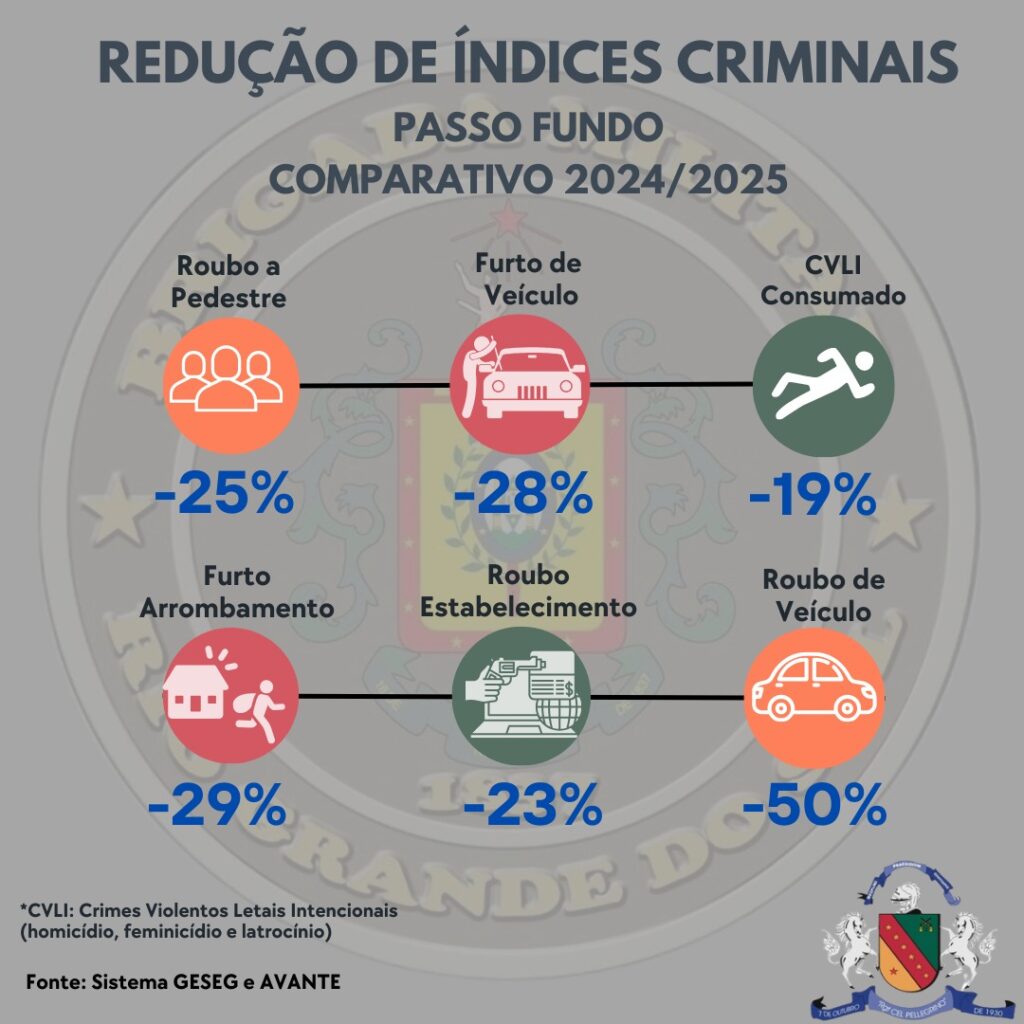 A Brigada Militar atua de forma permanente na promoção da segurança pública e no combate à criminalidade. No ano de 2025 em Passo Fundo, foi possível alcançar uma redução significativa nos índices criminais, evidenciando a efetividade das ações policiais desenvolvidas no município, em especial do 3° RPMon.