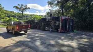 A carreta transportava um composto utilizado na fabricação de pneus. A empresa responsável iniciou na manhã de hoje o processo de baldeamento da carga para possibilitar a remoção completa do veículo, operação que deve se estender ao longo do dia.