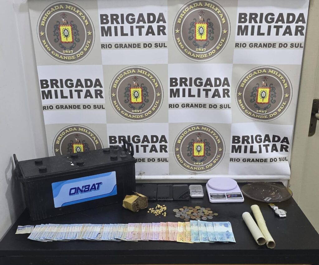 Entre os materiais apreendidos estão diversas pedras de crack, um tijolo de maconha, duas balanças de precisão, três aparelhos celulares e R$ 655 em dinheiro.
