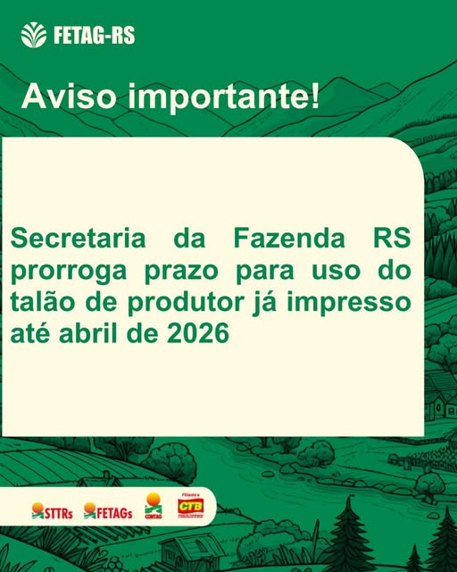 A Secretaria da Fazenda do Estado do Rio Grande do Sul (SEFAZ-RS) prorrogou até 30 de abril de 2026 o prazo para utilização do talão de produtor rural já impresso, modelo A4, para a emissão de Nota Fiscal nas operações internas. A decisão representa uma importante conquista da Federação dos Trabalhadores na Agricultura do Rio Grande do Sul (FETAG-RS), resultado do diálogo permanente da entidade com o governo estadual em defesa dos agricultores familiares.