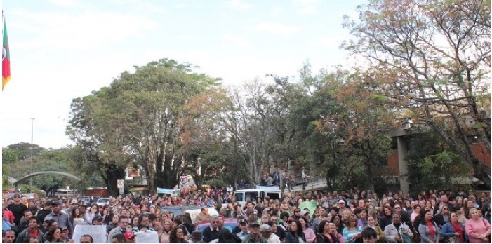 O pátio da Prefeitura de Passo Fundo foi tomado na tarde dessa segunda-feira, 27, por uma multidão de servidores municipais. A assembleia que foi marcada para as 15h, no Plenarinho da Câmara Municipal de Vereadores, teve que ser transferida para o lado externo do prédio, já que o número de participantes no momento excedia o limite apresentado para aquele espaço.