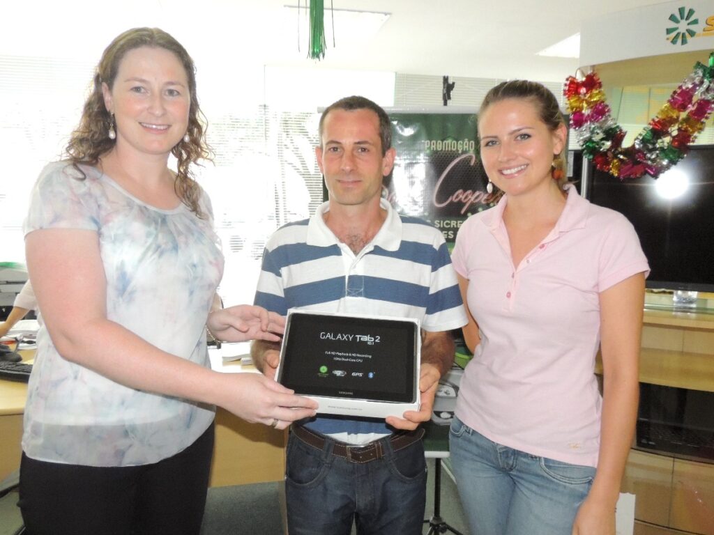 O associado Alexandre Camozzato Zaffari foi o ganhador do 9º e último tablet sorteado na promoção Sorte Cooperada Sicredi. O último sorteio da primeira fase da promoção aconteceu na tarde de sexta-feira, 17, na unidade do Sicredi do Centro de Passo Fundo. Os cupons haviam sido colocados na urna pouco antes de acontecer o sorteio e Alexandre diz que, quando chegava em sua empresa para trabalhar, recebeu um telefonema da cooperativa, dizendo que ele havia sido contemplado. “Eu não esperava ganhar e nem sabia do sorteio, ontem (quinta) que fiquei sabendo. A gerente de contas avisou que tinha sorteio e que era para vir buscar os cupons. Busquei, preenchi, coloquei na urna e já fui sorteado”, conta Alexandre. Ele recebeu o prêmio da gerente administrativa, Miriam Leonice Kerkhoff e da gerente de pessoa física, Geisi Werzenska.