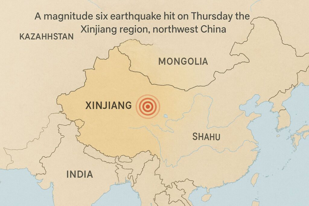 Um terremoto de magnitude seis atingiu nesta quinta-feira o distrito de Akqi, na sub-região autônoma da etnia Kirgiz de Kizilsu, na Região Autônoma Uigur de Xinjiang, no noroeste da China, às 15h44 (horário de Beijing), de acordo com o Centro de Redes Sísmicas da China (CENC).