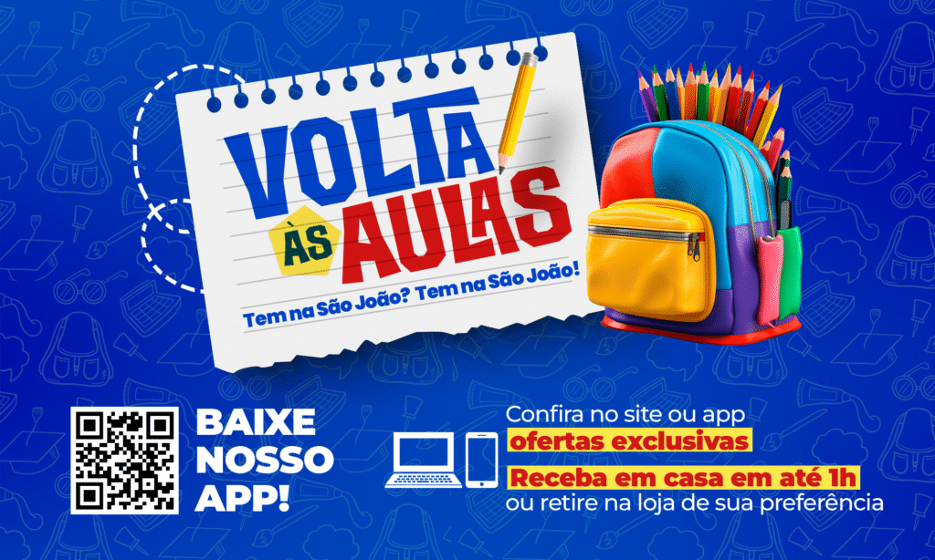 Além das lojas físicas, os materiais escolares e itens de cuidados podem ser adquiridos de forma prática através do site e aplicativo da Rede de Farmácias São João, permitindo que pais e responsáveis montem o kit completo sem sair de casa.
